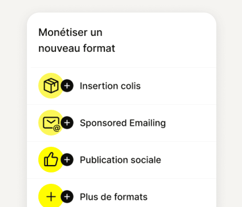 Développez des collaborations publicitaires avec des annonceurs sélectionnés et monétisez votre audience. Un revenu incrémental qui améliore votre rentabilité et finance votre croissance
